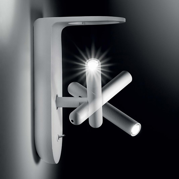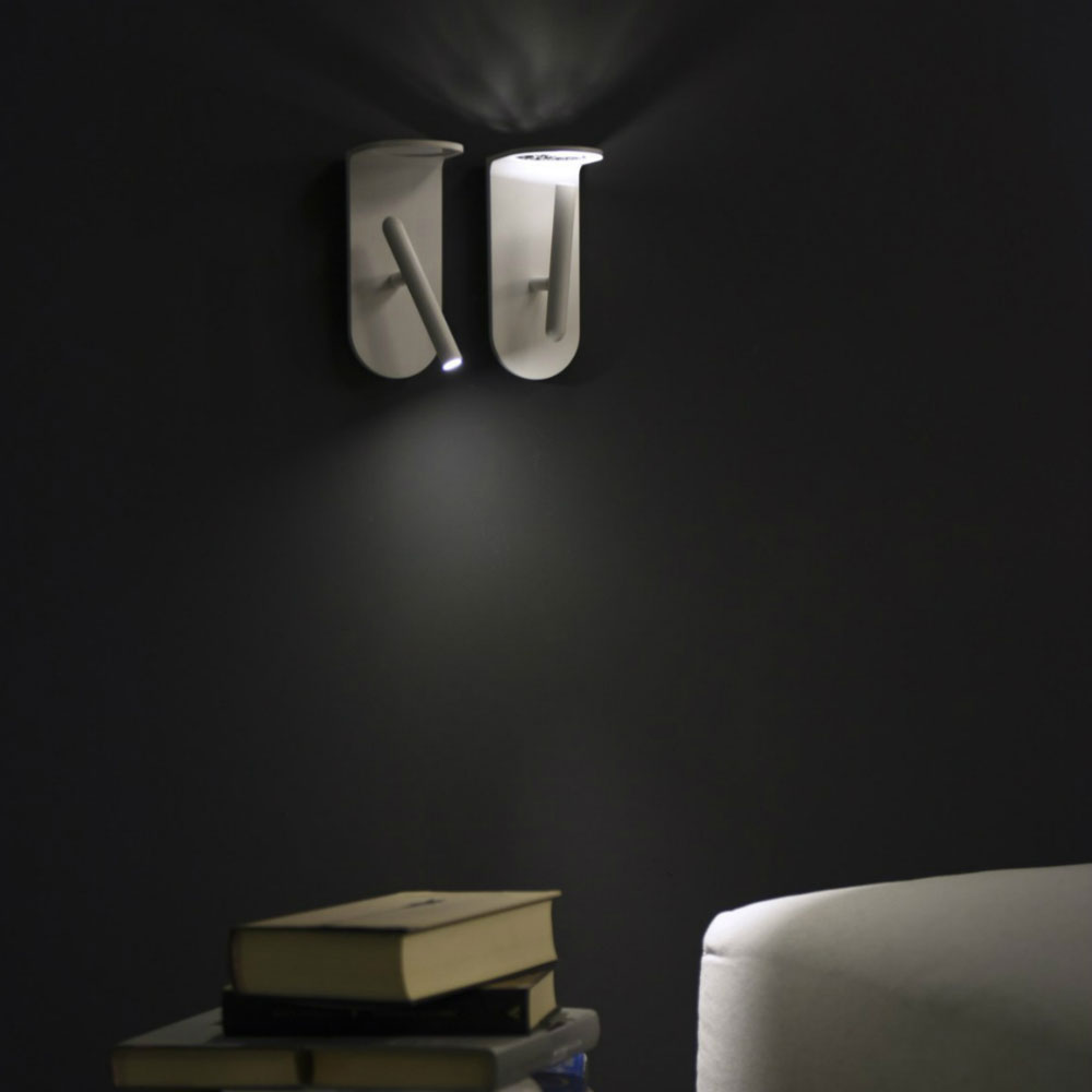 Preziosa e funzionale lampada disegnata dal famoso designer svizzero Davide Oppizzi. Il nome evoca la duplice funzionalità legata al tipo di utilizzo e alla collocazione, sopra la testiera del letto o a parete. La sorgente LED è alloggiata in un cilindro di alluminio pensato appositamente per essere ruotabile e orientabile, il diffusore è in policarbonato trasparente.