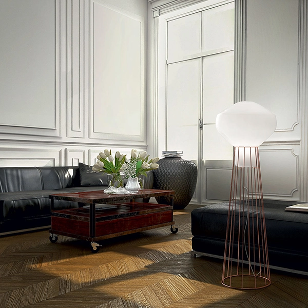 Scenografica, importante e preziosa, la versione da terra di Aérostat è un gioiello dell'illuminazione di design contemporaneo. Perfetta ovunque la si posizioni, che sia un'abitazione privata o un hotel, un bar o un ristorante. Il diffusore è in vetro soffiato bianco lucido e la struttura è in metallo ottonato, cromato nero o ramato. Crea atmosfere rilassanti e piacevoli in ogni ambiente.