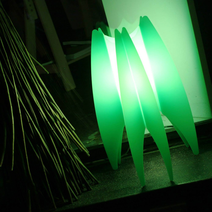 Serie di lampade da tavolo in materiale palstico completamente riciclabile con brevetto internazionale nei colori arancio,verde,rosso,lilla.