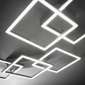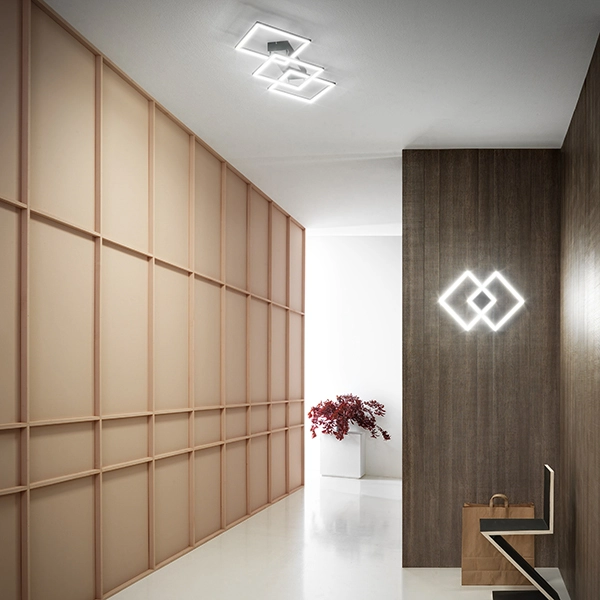 Questa lampada a parete/soffitto è puro design. Si può installare a parete o a soffitto e si caratterizza per una grande semplicità e leggerezza. Si può avere un effetto a zig-zag fluido e lineare oppure, ruotando di 45° la sua installazione, si ottiene una configurazione più intima e compatta. Montatura in alluminio bianco satinato, titanio e oro. Diffusore in silicone bianco opale. Sorgente luminosa led.
