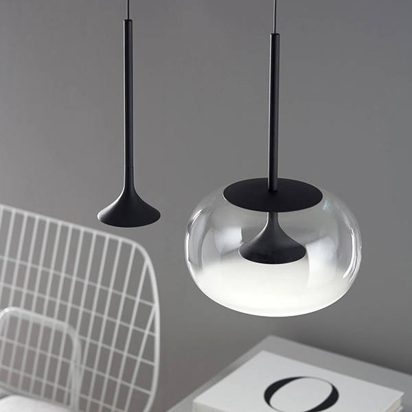 Lampada a sospensione moderna che s'inserisce alla perfezione in diversi ambienti, da quelli residenziali a quelli ricettivi o commerciali. La sua linea minimal, la rende una soluzione versatile che si adatta a diversi stili di arredamento. Disponibile in due finiture ricercate: cromo e nero. La struttura è in alluminio e acciaio,mentre il diffusore è in PMMA.