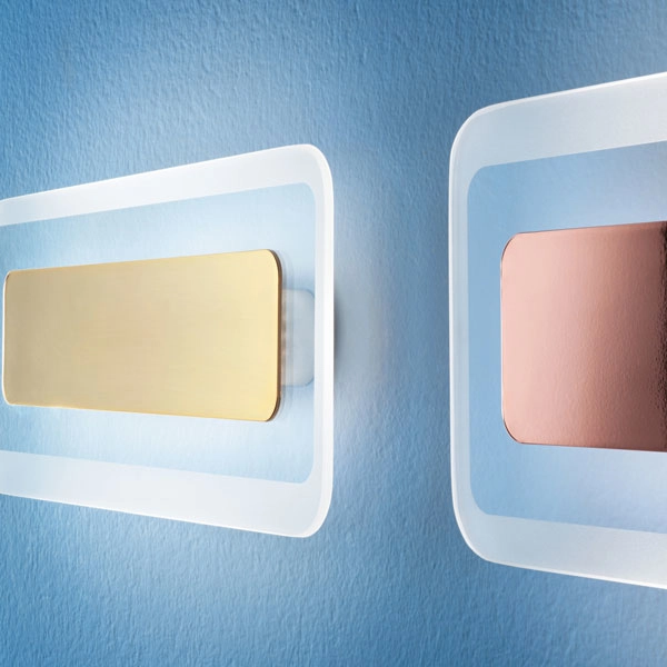 Applique moderna a led con elegante diffusore in vetro con bordo sabbiato non simmetrico. L'elemento centrale in metallo è disponibile nelle finiture rame, oro, cromo e bianco goffrato. La montatura è in metallo bianco e la sorgente luminosa è a LED. Grazie alla sua versatilità, può essere collocata in vari spazi della casa, oppure nelle stanze di una struttura ricettiva.