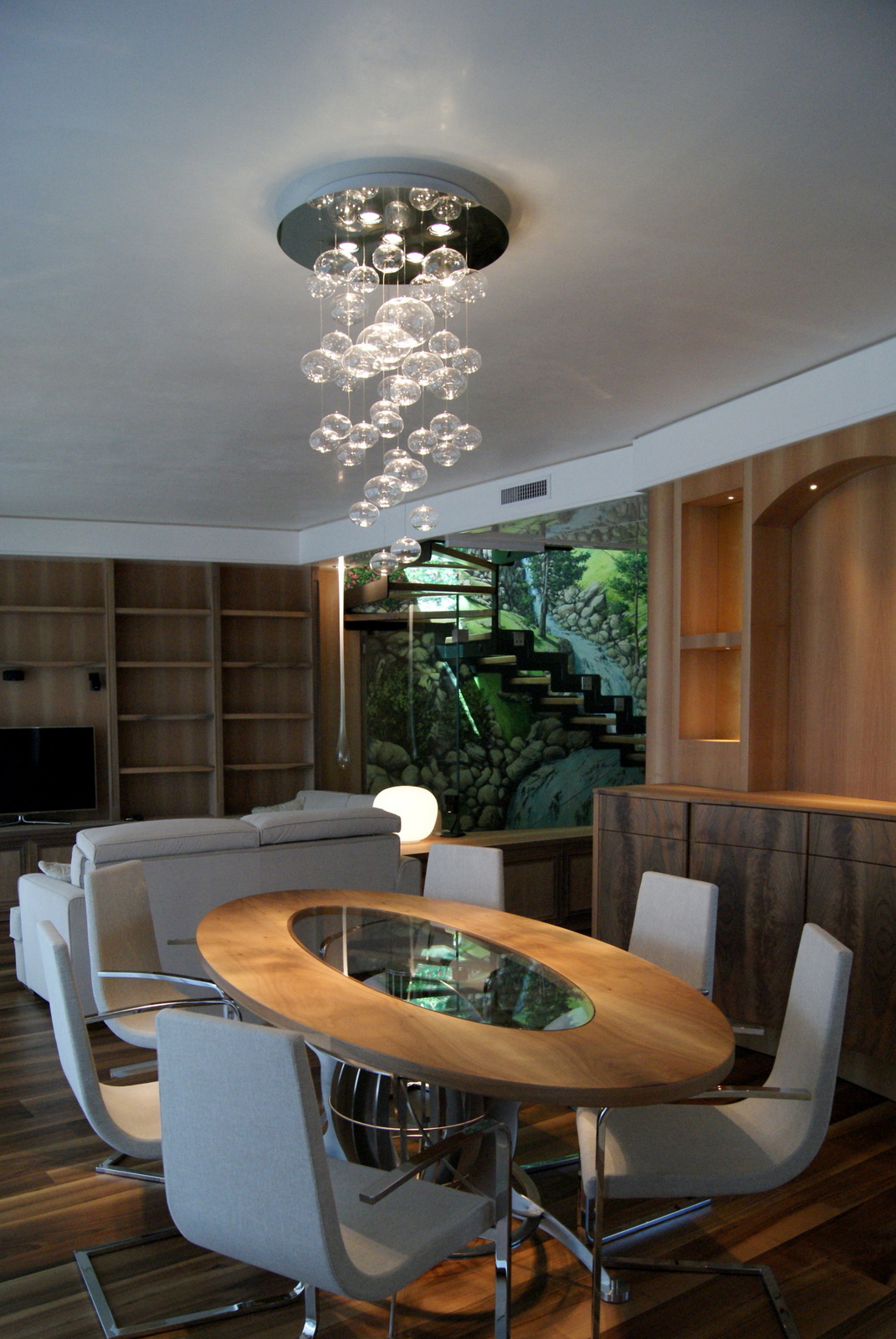 Belle lampade, accuratamente selezionate, illuminano un attico con finiture di pregio. Faretti ad incasso accolgono l'ospite all'ingresso e lo accompagnano lungo i corridoi. Il rivestimento delle pareti è impreziosito dalla luce di eleganti appliques. Una cascata di sfere trasparenti illumina il tavolo da pranzo della domenica. Nicchie con piccoli punti luce. Raffinate sospensioni a LED scendono sul piano lavoro della cucina.
