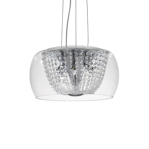 Lampadario estremamente elegante e prezioso, adatto ad illuminare con classe ambienti arredati in stile moderno. Perfetto anche per forniture contract di hotel e alberghi di classe. La montatura è in metallo cromato, il diffusore in vetro soffiato con all'interno delle splendide catene di ottagoni in cristallo. I cavi di sospensione sono in acciaio ed è possibile regolarli in lunghezza attraverso dispositivi automatici.