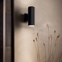 Applique da esterno con corpo luce in alluminio pressofuso rifinito con vernice a polveri opaca. Il doppio diffusore, superiore e inferiore, è in vetro temperato trasparente.