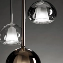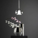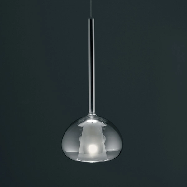 Lampada a sospensione con vetro borosilicato soffiato in tre colori: trasparente, cromo e bronzo. Rosone verniciato bianco. Attacco G9. Questa soluzione è perfetta per essere posizionata sopra la tavola da pranzo, in cucina e in generale in tutta la zona giorno di abitazioni arredate sia in stile moderno che più classico, grazie all'eleganza del vetro. Disponibile in due misure.