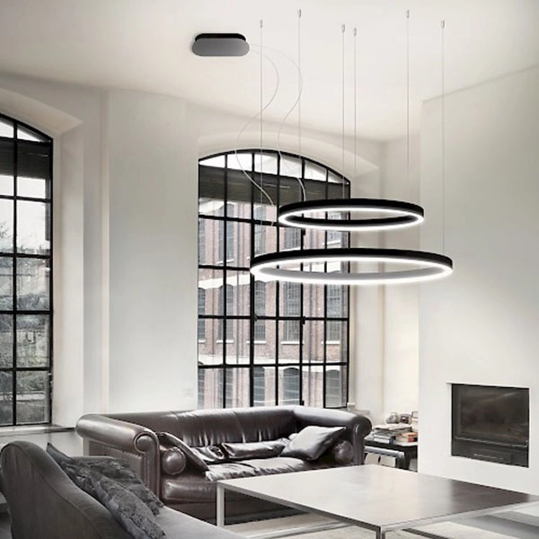 Bellai home in questa versione è una splendida composizione di due anelli luminosi con emissione diretta ed indiretta dalla struttura compatta e leggera. Disponibile in nero con diffusore in PMMA e alimentatore remoto contenuto nel rosone a soffitto. Questo lampadario si posiziona con stile in ampie zone living e all’interno delle hall di strutture ricettive. Made in Italy.