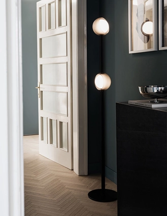 Bloom in questa versione è una lampada da tavolo ideale come oggetto di arredo che valorizza ogni ambiente, dal soggiorno alla camera da letto. Ha una montatura in metallo verniciato a polveri o placcato e diffusore in vetro soffiato bianco acidato. Colori disponibili: montatura rigata nera con vetro esterno grigio satinato, montatura ottone spazzolato con vetro esterno rigato ambra trasparente.