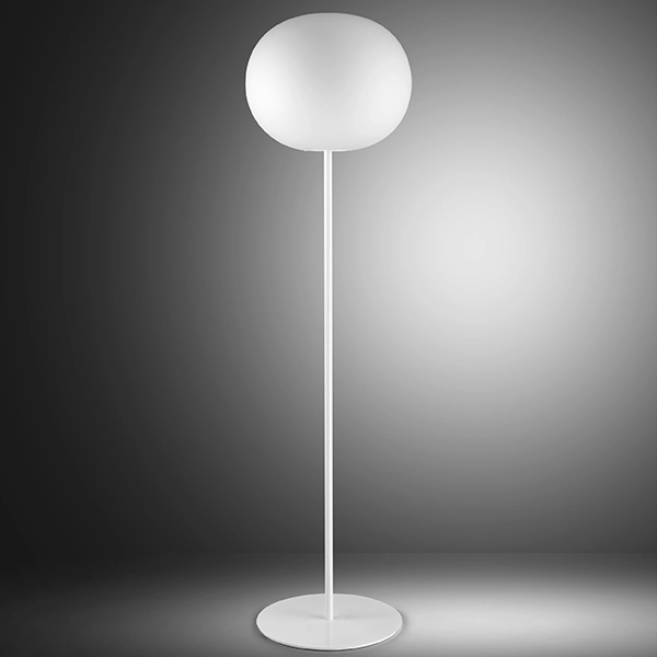 Bolero è una lampada da terra in vetro soffiato bianco satinato elegante e minimal che illumina ogni angolo della casa e di hotel con grande stile. Le parti metalliche sono in bianco opaco. Made in Italy.