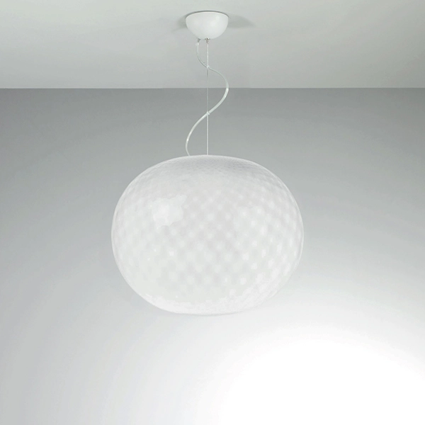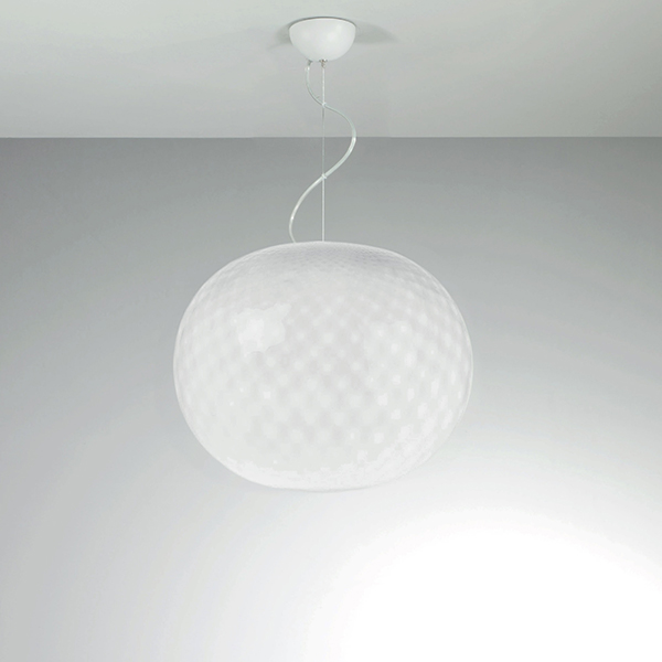 In questa versione la sospensione Bolero è ancora più originale. Il corpo luce è in vetro soffiato bianco baloton e le parti metalliche in laccato bianco opaco. Disponibile in 3 misure: 19, 33 e 45 cm questa soluzione illumina grandi spazi di abitazioni private, strutture ricettive, negozi e locali. Made in Italy.