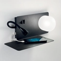 Book, applique smart e funzionale con doppio interruttore, presa USB e piano dove poter appoggiare il cellulare o un libro. Questa soluzione è perfetta per essere posizionata in camera da letto e all'interno degli hotel. La montatura è metallica verniciata a polveri, mentre il diffusore è realizzato in vetro satinato. Il braccio è flessibile e gommato con LED. Disponibile nei colori: bianco e nero.