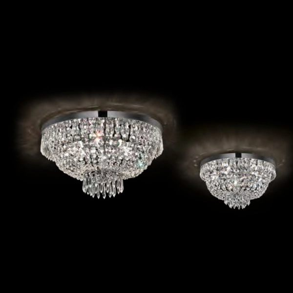 Montatura in metallo con finitura in oro o cromo. Elementi decorativi in cristallo molato ottagonali con finali a puntate.