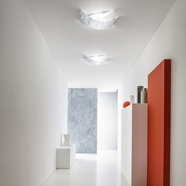 Camilla è una lampada da soffitto moderna con montatura in metallo bianco e diffusore con vetri colorati foglia oro o foglia argento. Finitura lucida. Illumina diversi ambienti, dal corridoio fino alla zona notte. Soluzione perfetta anche per hotel.
