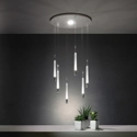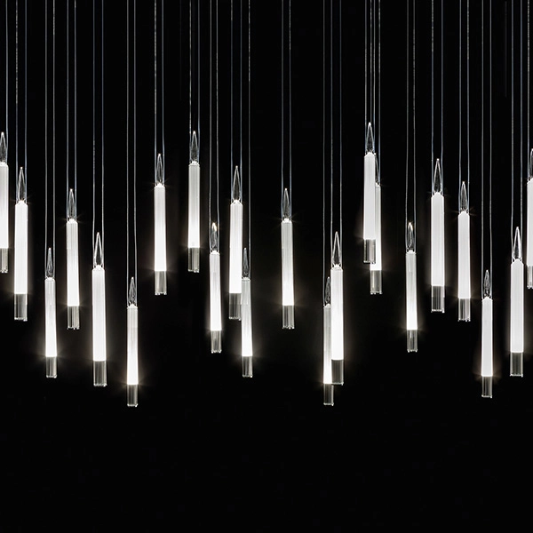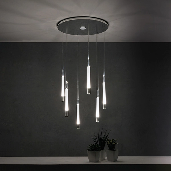 Candle è una sospensione di design a 6 luci composta da tubi in vetro borosilicato rigato che presentano al proprio interno un cilindro in PMMA sabbiato. Alla base si trova un LED la cui luce si diffonde lungo tutto il corpo della lampada. Il cavo di alimentazione sostiene la lampada e permette di regolarne l’altezza. Il rosone è realizzato con una struttura a soffitto verniciata in bianco e da un disco di copertura in acciaio lucido. Materiali: vetro pirex, PMMA, metallo. Made in Italy.