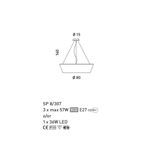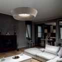 Lampadario con corpo luce rivestito in tessuto e montatura in acciaio cromato.
