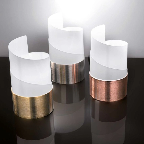 Lampada da tavolo elegante che porta un tocco di preziosità nel tavolo dove è collocata. Nella zona living, nello studio o in camera da letto questa soluzione versatile si adatta ad ogni ambiente. Il diffusore in policarbonato satinato è avvolto da particolari in metallo: bianco, nero, nichel satinato, oro satinato e rame satinato.