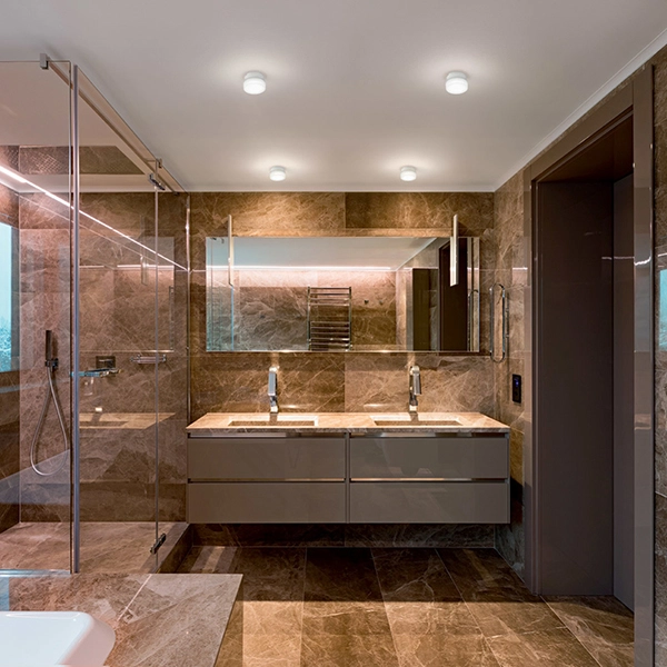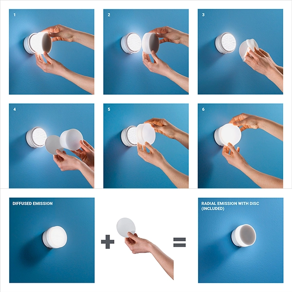 Chobin65 è una lampada decorativa da parete con grado di protezione IP65, ideale per interno ed esterno di abitazioni private, strutture ricettive, spazi commerciali. Dispone di un punto luce con sorgente LED integrata. La base è in policarbonato, mentre il diffusore è in silicone e può cambiare velocemente l’emissione della luce, da diffusa a radiale. I dischetti sono personalizzabili, un vero e proprio valore aggiunto di questa lampada! Il disco in metallo per luce radiale è incluso.
