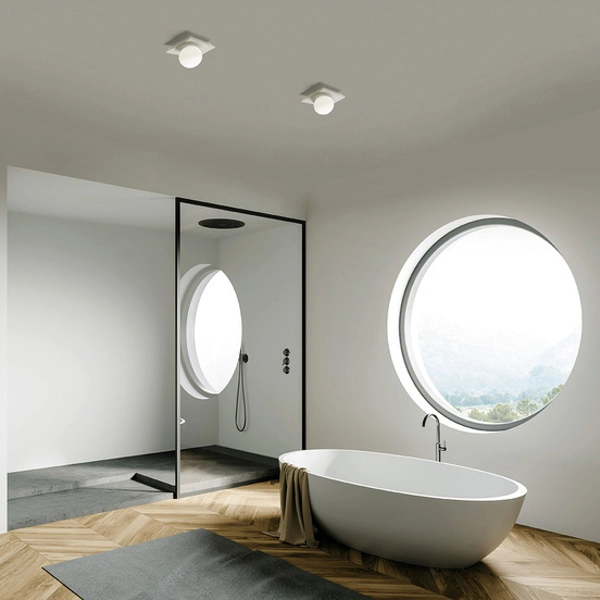Cicladi in questa versione a soffitto si presta a più collocazioni, dal bagno alla camera da letto. Struttura in gesso indurito, diffusore in vetro tondo soffiato.