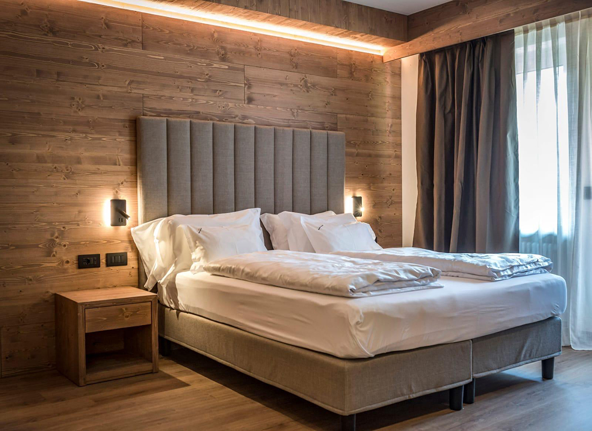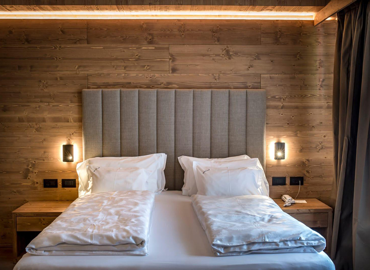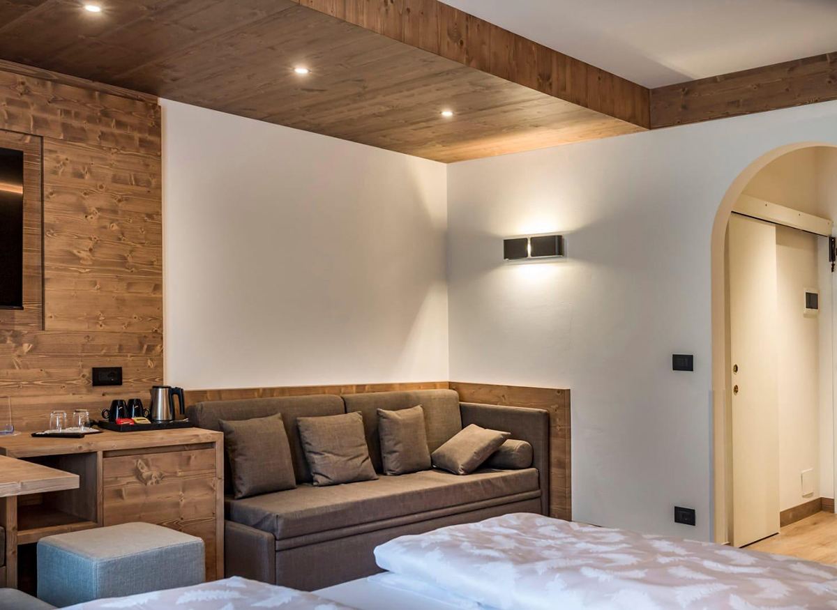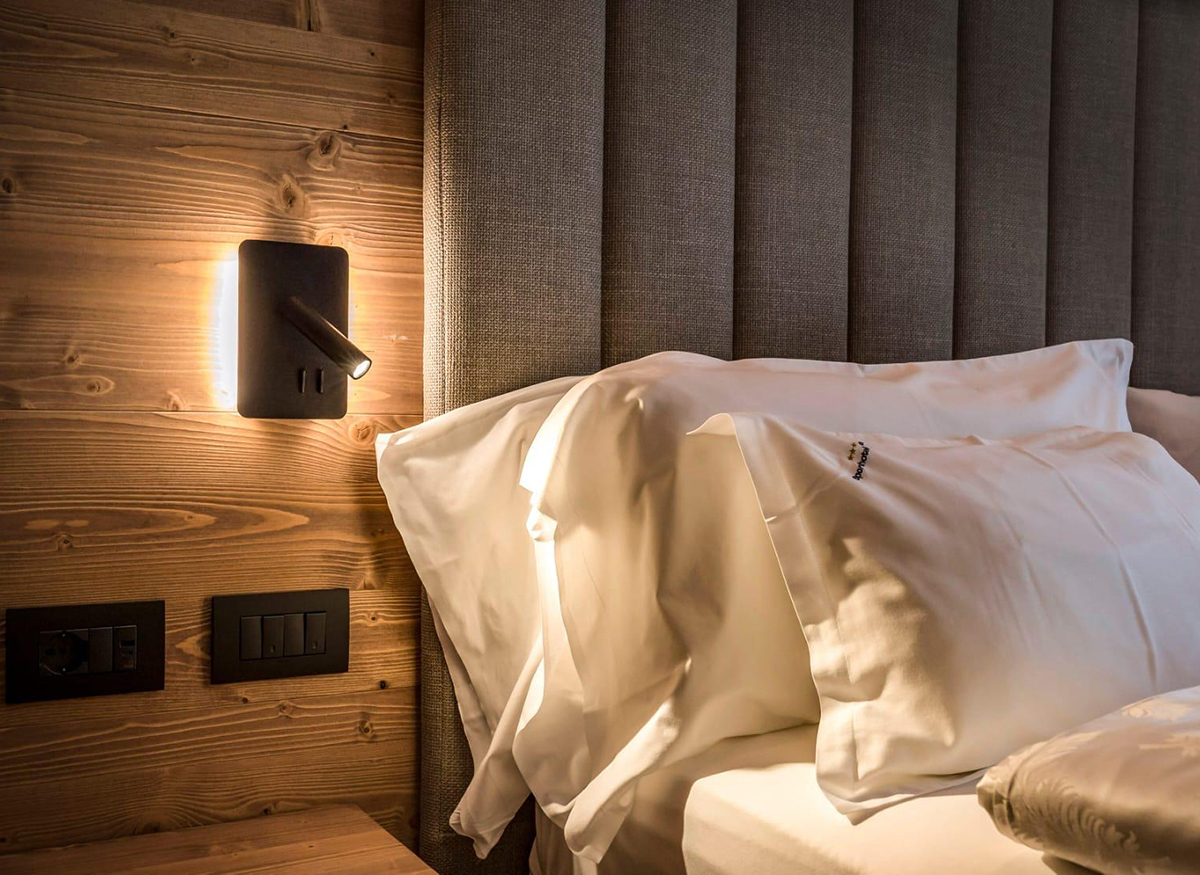 Ogni camera dello Sporthotel Arabba è oggi caratterizzata da un equilibrio tra luce d’accento e illuminazione generale, con lampade perfettamente uniformate all’arredo.