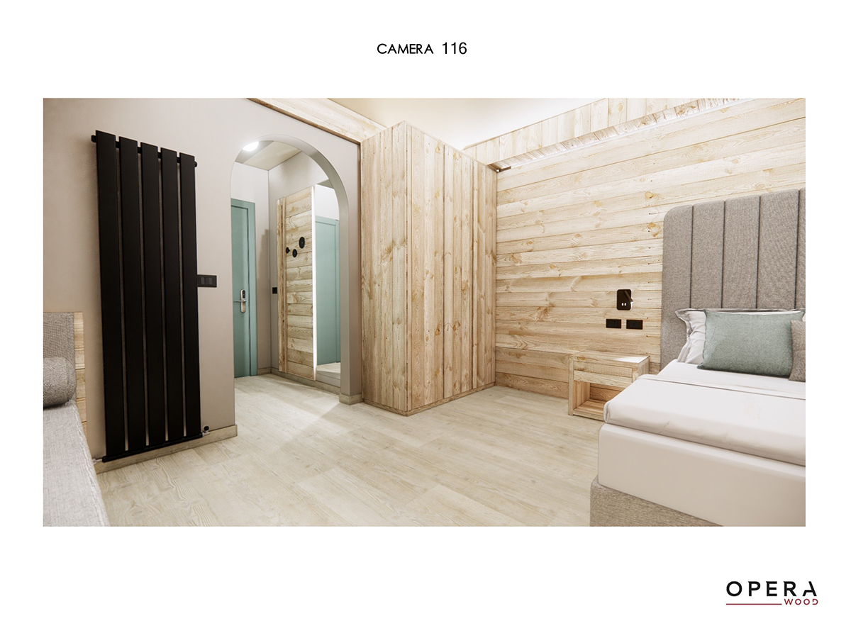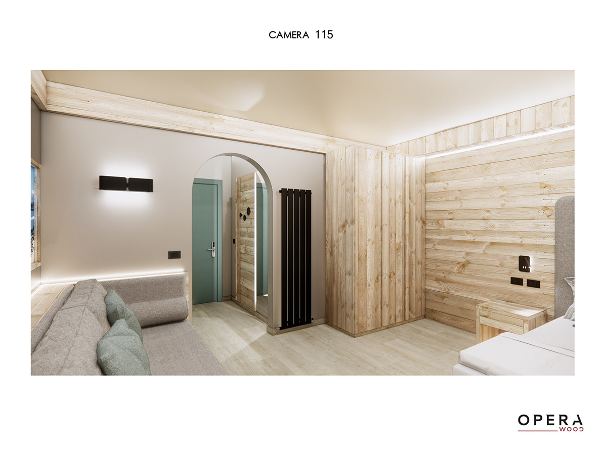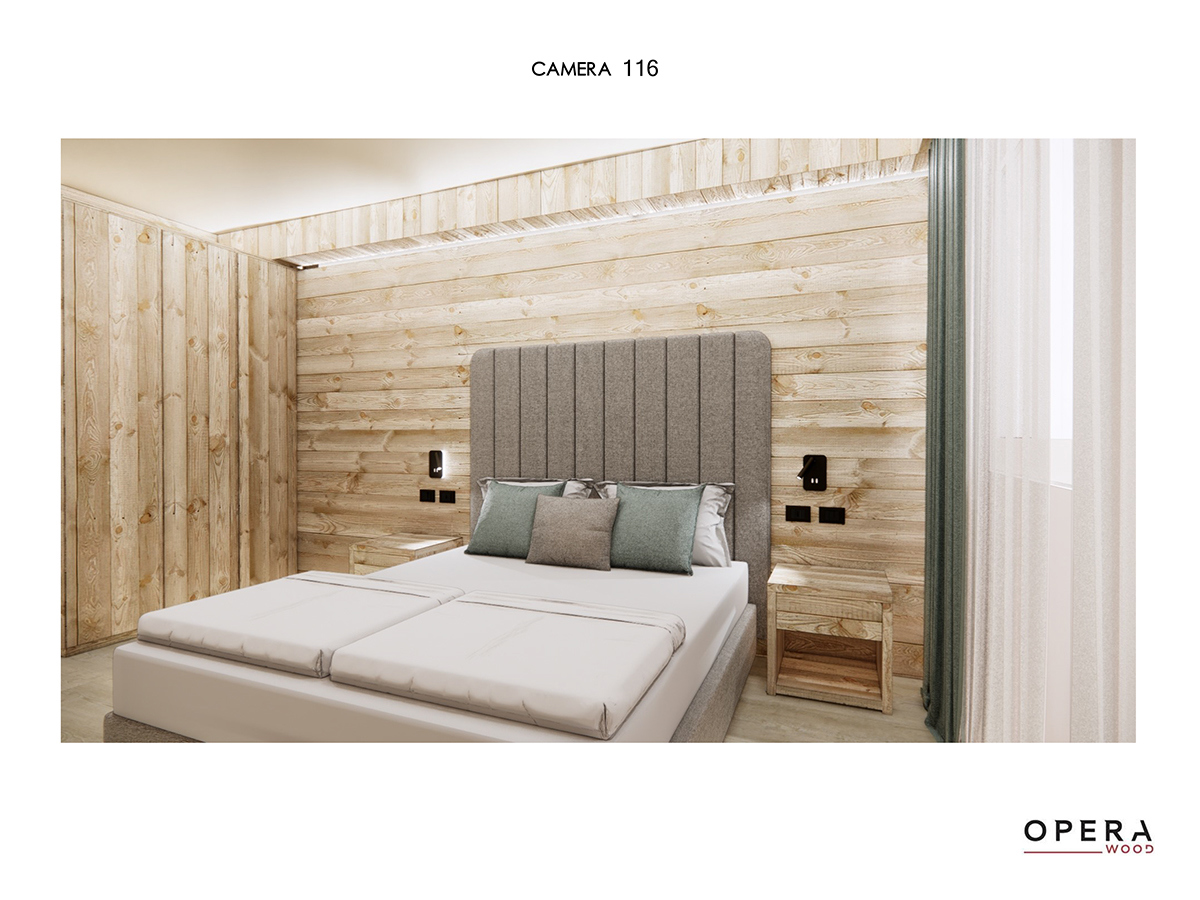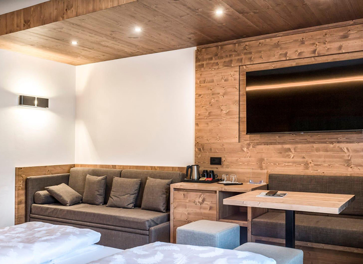 Ogni camera dello Sporthotel Arabba è oggi caratterizzata da un equilibrio tra luce d’accento e illuminazione generale, con lampade perfettamente uniformate all’arredo.