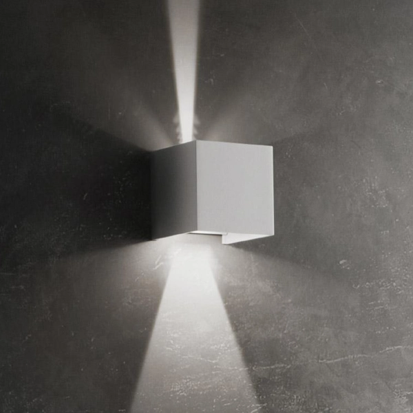 Sia da esterno che da interno, Cubetto è un'applique dalle linee geometriche ed eleganti. Illumina sia dalla parte superiore che inferiore, regalando dei coreografici giochi di luce.