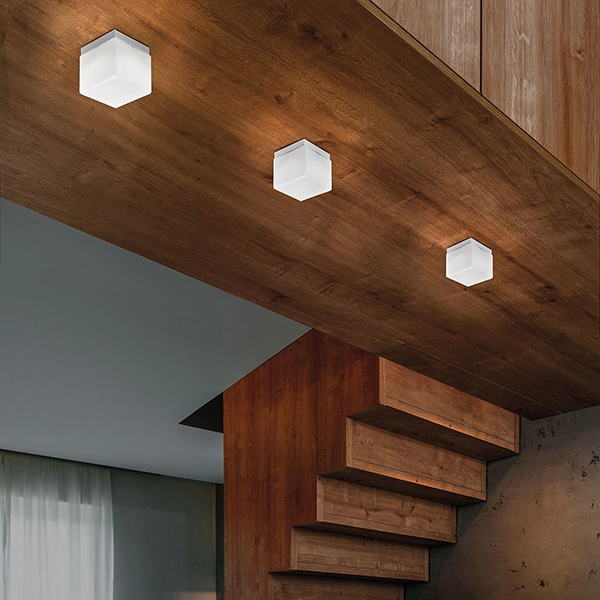 Dado è una soluzione dalle linee semplici ed eleganti. In vetro soffiato triplex opale satinato, questa lampada può essere utilizzata a parete o soffitto e presenta un particolare sistema di fissaggio a magneti, che oltre a semplificare le installazioni è anche molto pratico per la manutenzione ordinaria.