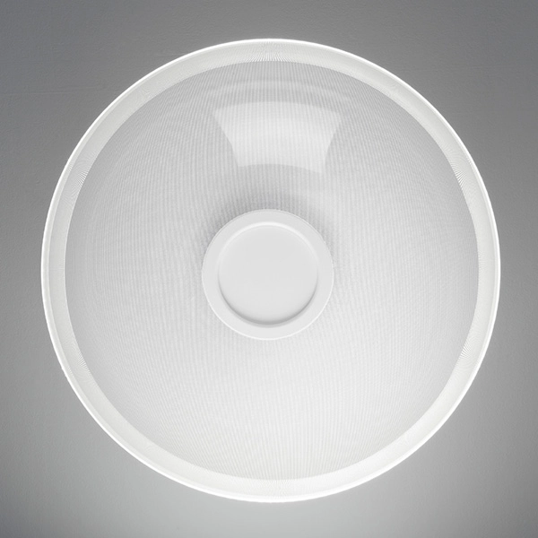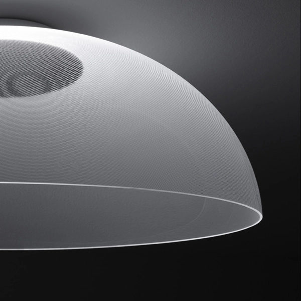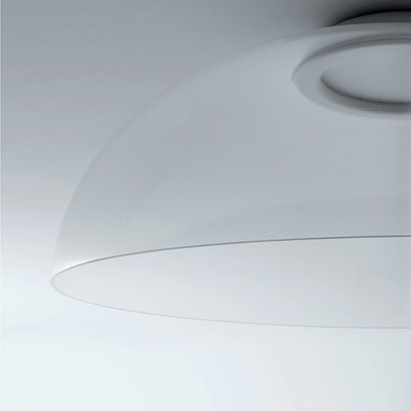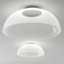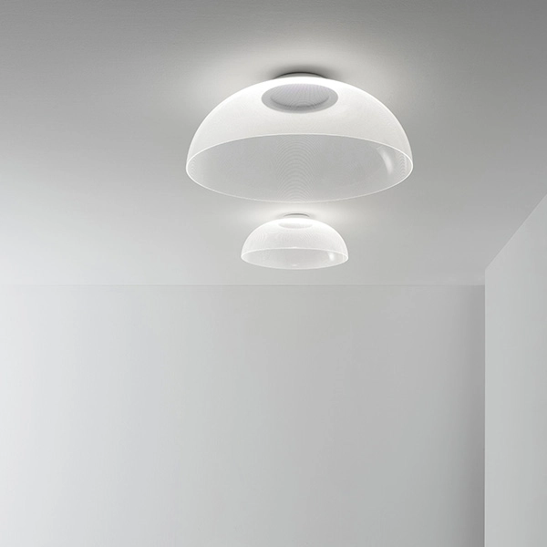 Demì è una lampada di grande design con esclusiva tecnologia OptiLight™. Un'ampia cupola trasparente da spenta che quando viene accesa, diffonde un’illuminazione morbida e omogenea. La sorgente topLED dimmerabile è posta nell'anello del grande foro superiore. Diffusore in PMMA trasparente microinciso al laser e termosoffiato. Montatura a parete/soffitto in alluminio verniciato bianco.