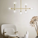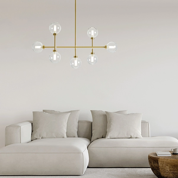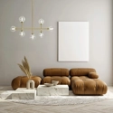 Dom è una lampada a sospensione a 7 luci in vetro borosilicato trasparente e cilindro satinato. Dotata di una montatura in ottone spazzolato, questa lampada può essere regolata a piacere in altezza grazie ai i tubi di cm 40 e cm 50. Può essere posizionata sopra ad un tavolo o in soggiorno, a seconda delle esigenze.