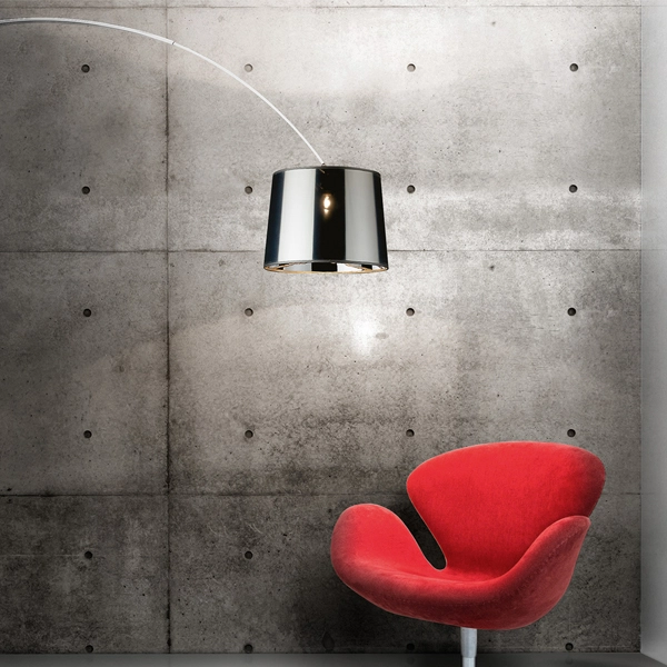 Lampada da terra con montatura in metallo rifinito in cromo o con vernice opaca bianca o nera. Braccio a sezione quadrata composto da tre elementi. Paralume in lamina di PVC, disponibile in colore cromo o rivestita in tessuto bianco o nero. Lampada con interruttore integrato.