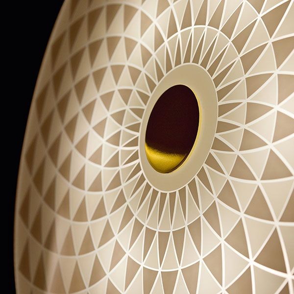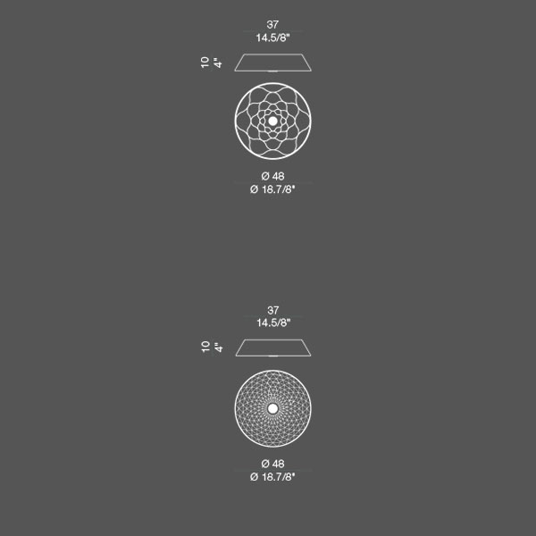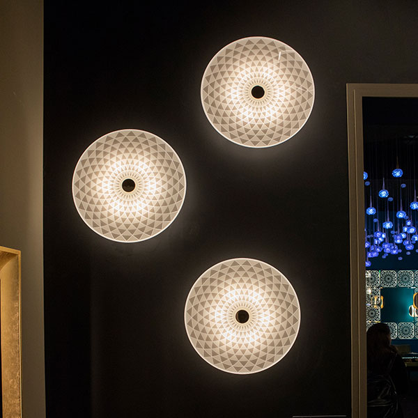 La bellezza del disegno geometrico è esaltata da questa applique/plafoniera. Il diffusore è realizzato in vetro decorato e presenta diversi strati serigrafati che creano una decorazione luminosa visibile solamente accendendo la lampada. Il diffusore, inoltre, è avvolto da un elemento strutturale in PMMA prismatico che diffonde la luce in modo omogeneo nell’ambiente. A luce spenta, si notano solo i contorni del decoro floreale o orientale. Una soluzione elegante per illuminare abitazioni private, strutture ricettive e locali. Lampadine 6x3,4W E27 incluse. Materiali: vetro e PMMA. Rosone a soffitto: bianco. Dettaglio centrale in cromo per versione floreale e dorato per versione orientale. Made in Italy.