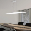 Serie di sospensioni con diffusore in polimetilmetacrilato satinato e struttura in metallo verniciato bianco raggrizante.