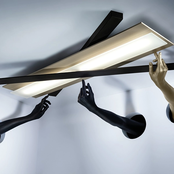 Eclips è una plafoniera moderna e elegante disegnata dal designer Oriano Favaretto. Si può aprire a ventaglio, gli elementi in alluminio verniciato ruotano così come il diffusore in vetro bianco acidato, formando effetti chiaroscurali obliqui e inaspettati. Questa soluzione è pensata per illuminare la zona giorno e la zona notte di un ambiente arredato in stile contemporaneo. Disponibile in diverse preziose combinazioni cromatiche.