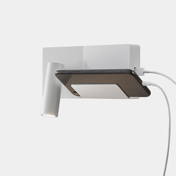 Elamp è un’applique da lettura minimal e moderna da posizionare vicino al letto nella camera da letto di abitazioni private o di strutture ricettive. Estremamente funzionale e tecnologica, questa lampada a parete è disponibile in bianco e nero metallizzato con porta cellulare in diversi colori: nero/bianco, grigio e oro. La struttura è in alluminio e la sorgente luminosa è a LED.
