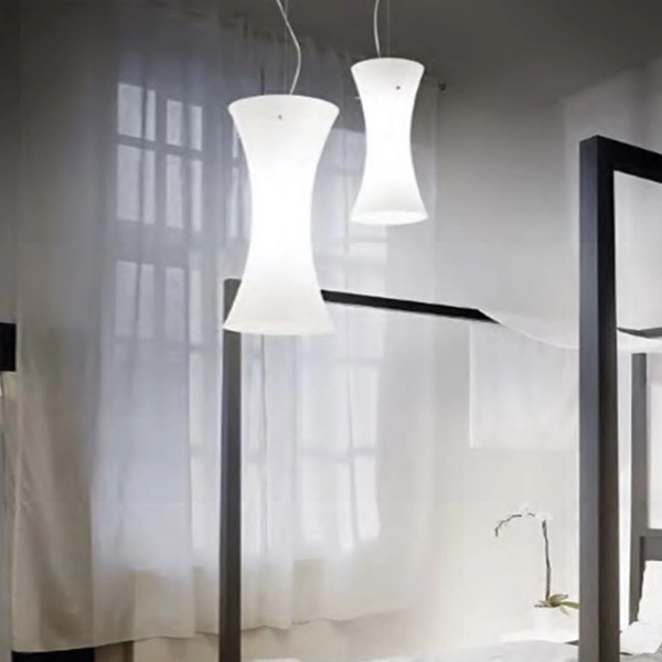Lampadario moderno con montatura in nickel satinato, diffusore in vetro bianco soffiato, incamiciato e acidato. Il cavo in acciaio è regolabile in lunghezza grazie al dispositivo ferma cavo automatico.