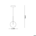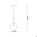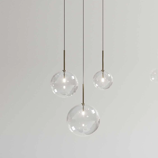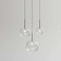 Lampada a sospensione in vetro soffiato disponibile in tre dimensioni con montatura a bracci in metallo con finitura cromo o ottone antico. I diffusori sono in vetro soffiato trasparente. Lampadine LED G4 2W 3000 K incluse.