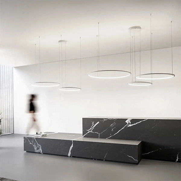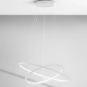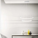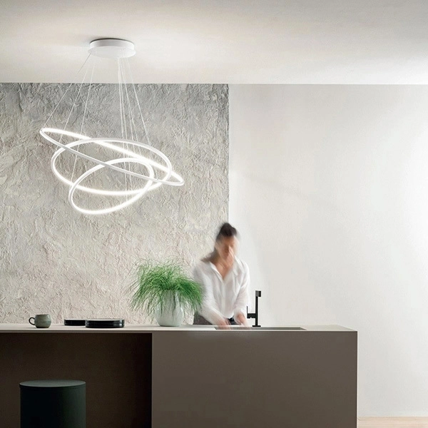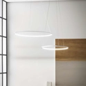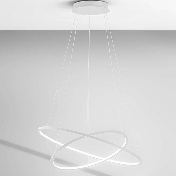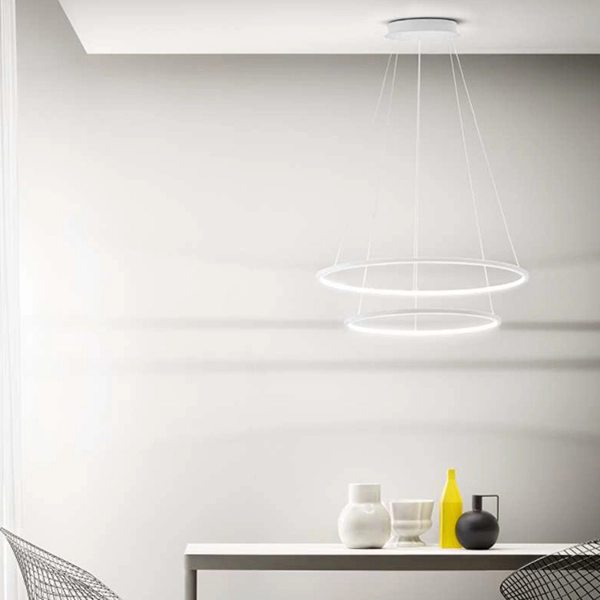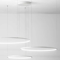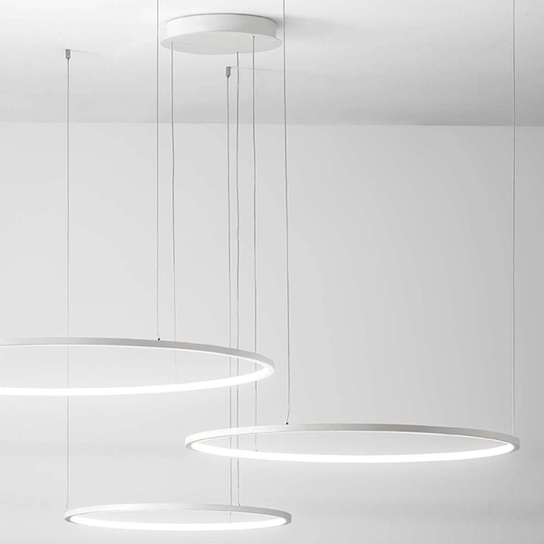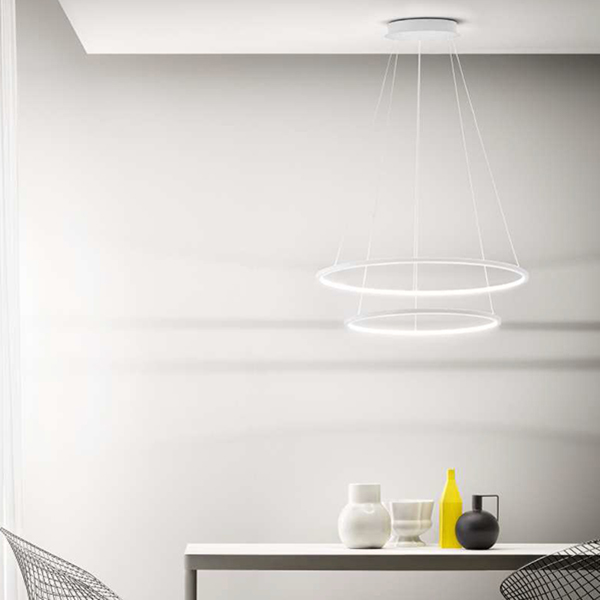 Uno splendido anello circolare con sorgente luminosa a led per creare un'atmosfera diffusa. Montatura in alluminio satinato bianco. Diffusore in silicone bianco opale. Sorgente luminosa led. Erika è disponibile a uno, due o tre dischi configurabili a diverse altezze.