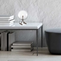 Estro è una lampada originale e simpatica che illumina ogni tavolo della casa, dalla scrivania al tavolino in soggiorno. La struttura è realizzata in brunito verniciato mentre il diffusore sferico è in vetro trasparente.