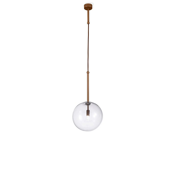 Estro, sospensione singola che scende con naturalezza e illumina con eleganza ogni ambiente. Da collocare sopra il tavolo in cucina o in soggiorno. Questa soluzione è perfetta anche per l'illuminazione di un locale. La struttura è realizzata in brunito verniciato mentre il diffusore sferico è in vetro trasparente.