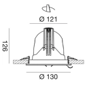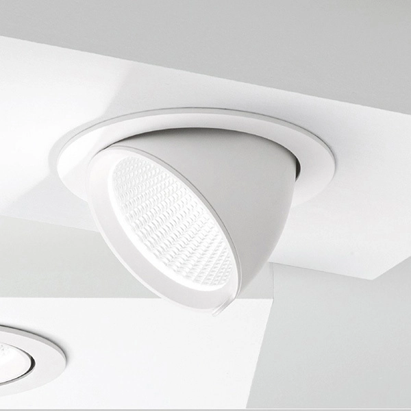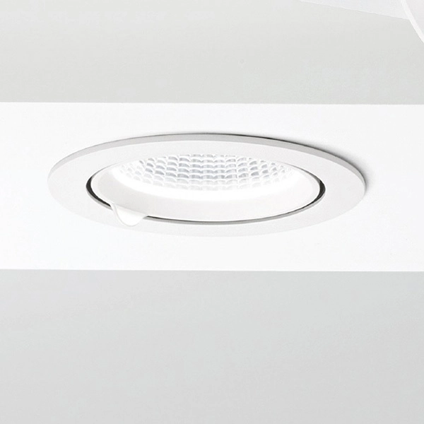 Faretto da incasso regolabile con struttura e dissipatore in alluminio. Finitura in bianco opaco. Diffusore in vetro trasparente.