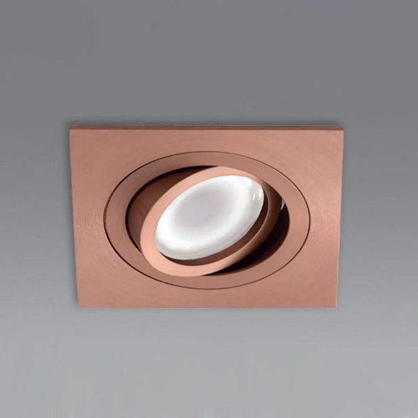 Faretto ad incasso orientabile con struttura in alluminio e finiture in bianco opaco, nero opaco, alluminio spazzolato, oro spazzolato o rame spazzolato. Ideale per forniture contract o per illuminare zone giorno di case arredate con stile moderno.