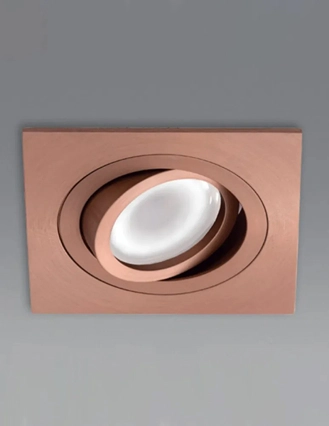 Faretto da incasso orientabile con struttura in alluminio. Finitura in bianco opaco, nero opaco, alluminio spazzolato, oro spazzolato o rame spazzolato. Soluzione perfetta per forniture contract o per illuminare zone giorno di residenze private.
