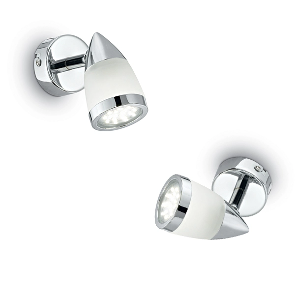 La montatura è in metallo cromato, il diffusore è orientabile ed è in vetro trasparente acidato con dettagli in cromo.