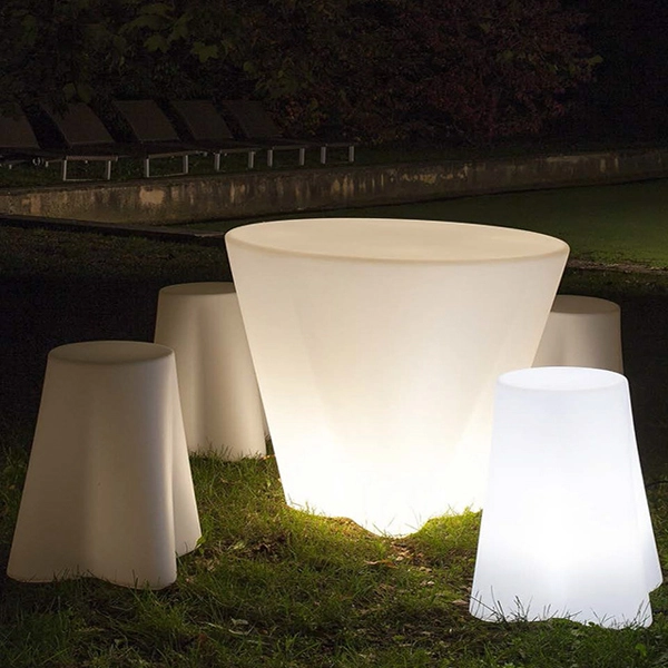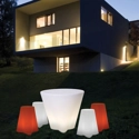 Flower, vaso luminoso che funge da vero e proprio arredo da esterno, per godersi appieno lo spazio all'aria aperta. Disponibile nelle versioni tavolo e seduta, dispone di un corpo diffondente in polietilene lineare bianco.