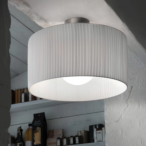 Morosini Fog PL50 Plissè. Lampada da soffitto moderna in metallo nichel satinato. Diffusore in vetro soffiato bianco latte satinato, paralume in tessuto Pongè plissettato avorio, bianco, nero e moca.