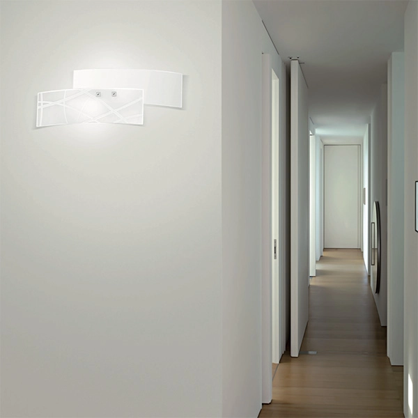 Applique che affascina per le trasparenze del vetro satinato. Frida presenta inoltre elementi centrali decorati da segni liberi, montatura in metallo e finitura cromo. Disponibile in due versioni è perfetta per le zone di passaggio della casa, dal corridoio alle scale.