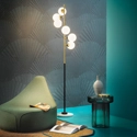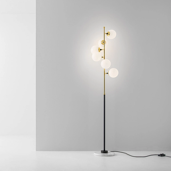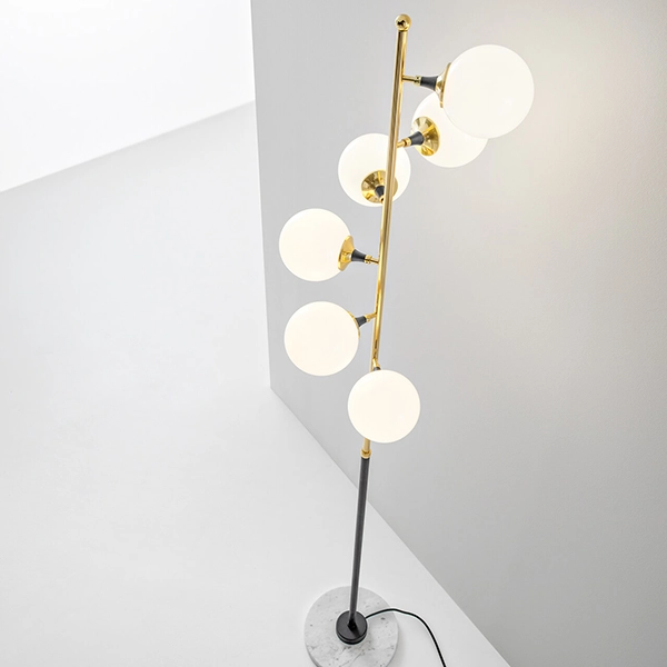 Una piantana che richiama il fascino degli anni ’50, Galassia arricchisce lo spazio con un tocco retrò e un movimento avvolgente dato dalle 6 sorgenti in vetro triplex bianco. La base in marmo bianco di Carrara impreziosisce inoltre questa lampada dallo stile unico. Corpo in metallo nero e in ottone con doratura galvanica. Diffusori in vetro triplex bianco. Base in marmo bianco di Carrara. Doppia accensione, lampadine LED 6W 2700K E14 incluse.
