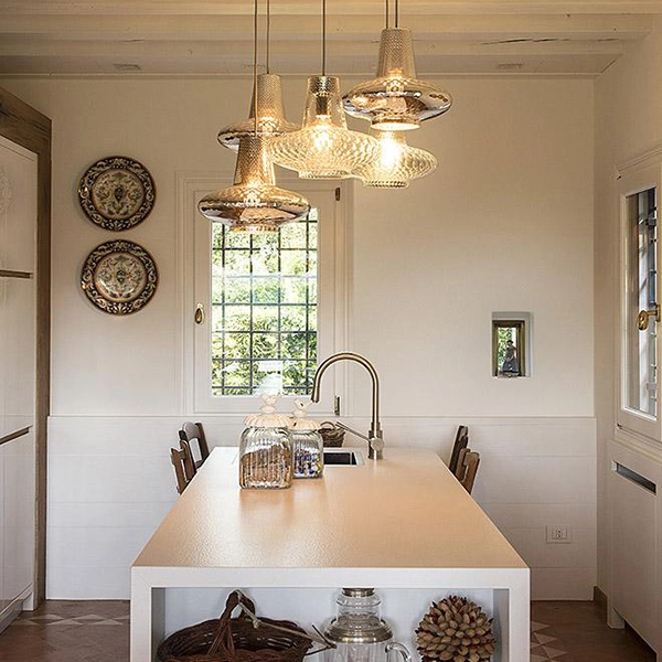 Giulietta, lampada a sospensione elegante e sofisticata che rende unico ogni ambiente. Ideale per essere collocata sopra il tavolo della cucina o di locali e ristoranti. La lavorazione in vetro soffiato a bocca con finitura a rilievo “balloton” permette di creare effetti ottici che si sprigionano in tutto l’ambiente. Disponibile in diversi colori design.