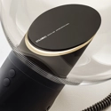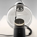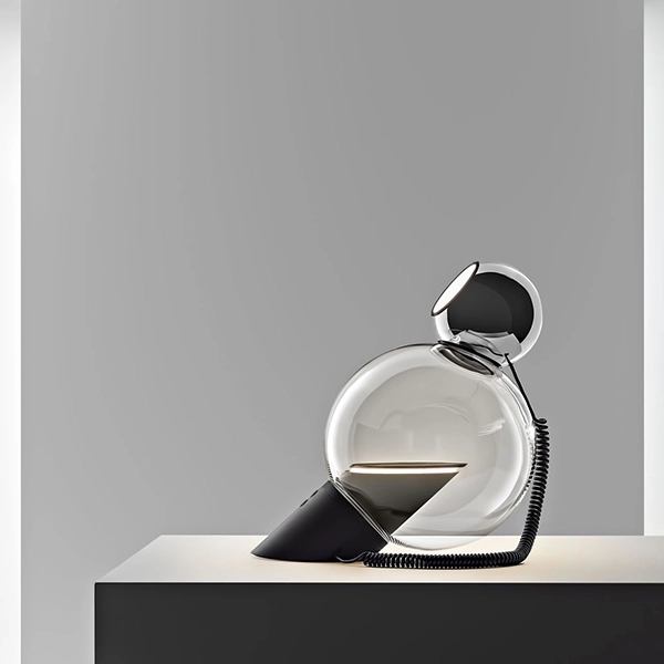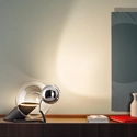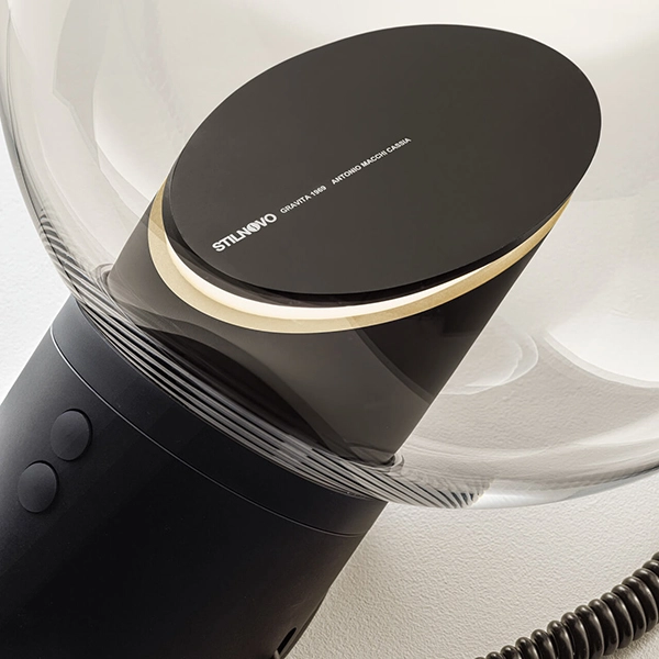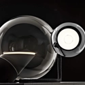 Una lampada iconica e di design con luce regolabile in intensità nella grande sfera di vetro che illumina morbidamente l’ambiente. La sfera metallica, più piccola, orbita sulla superficie grazie ad una soluzione magnetica di grande ingegno, proiettando una luce concentrata e dimmerabile. Concept del 1969 all’avanguardia rispetto ai canoni e alle lavorazioni di quel tempo e anche per quelli contemporanei. Diffusore in vetro soffiato trasparente extrachiaro, sfera orientabile in alluminio cromato. Base in estruso di alluminio anodizzato nero opaco. Sorgenti LED con accensioni separate dimmerabili.