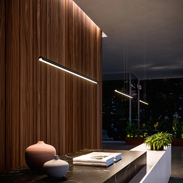 Sospensione moderna dal design lineare con una che scivola lungo la sinuosa curvatura interna del metallo e si diffonde morbidamente nello spazio sottostante. Diffusore in silicone. Ideale in diversi contesti per illuminare con stile e semplicità.