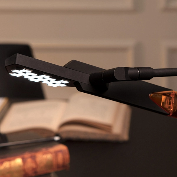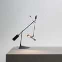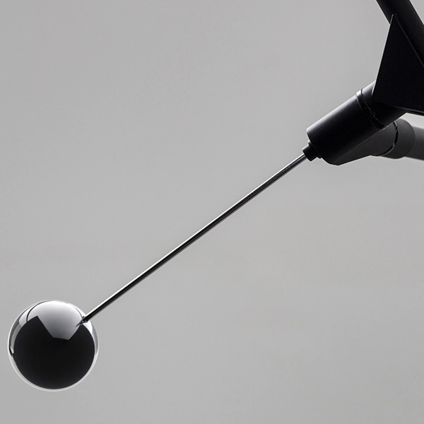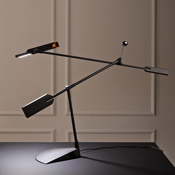 Grazie a 6 snodi e 360 gradi di rotazione per ciascuno, la lampada può muoversi liberamente in uno spazio tridimensionale. La sfera funge da equilibratore dell’intero peso dell’apparecchio, garantendone la stabilità.